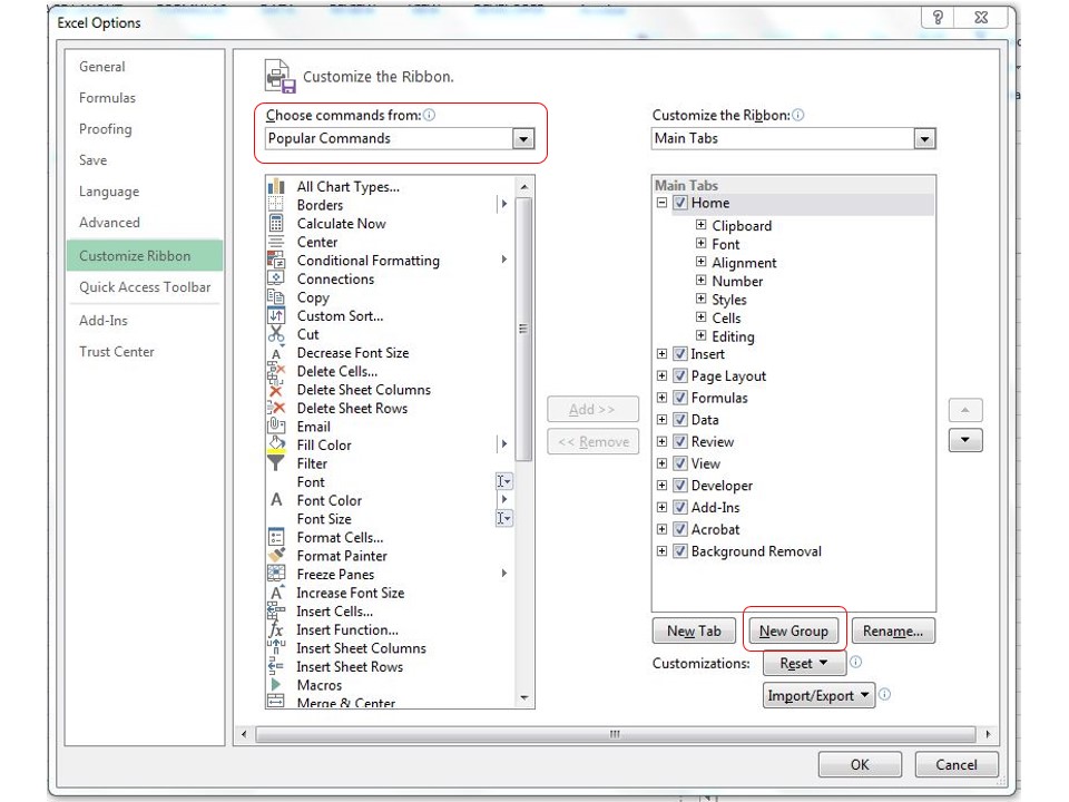 2. you can see to columns, column in the left shows all the commands, column in the right the Ribbon Tabs. Add new group in the Ribbon tab where you want your Add-Ins to be placed. select that group (the group label will be backed by a blue colour).